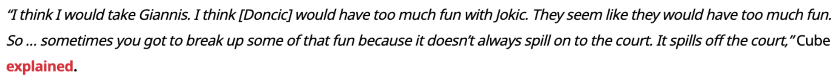 谈及詹姆斯未来离开湖人后,东契奇会和谁一起搭档,ICE CUBE表示:“我觉得我会选字母哥,我认为东契奇和约基奇在一起会玩得太疯,他们俩看起来就会玩得不亦乐乎,所以有时候你得给这种欢乐降降温,因为这些乐趣不一定能转化到赛场上,反而可能分散精力。”