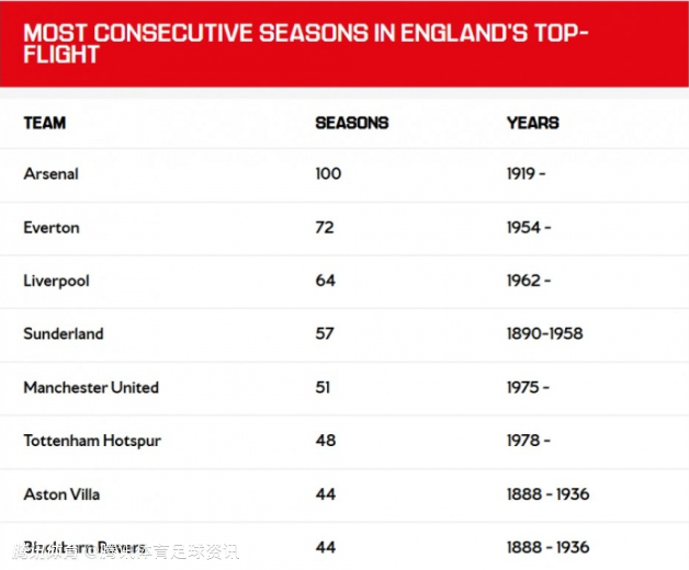 目前,六支拥有最长顶级联赛记录的球队中,有五支仍在继续,除了切尔西将在本赛季迎来第37个连续顶级联赛赛季外。曼城自2003/04赛季升入顶级联赛以来,已连续24个赛季保持不败。