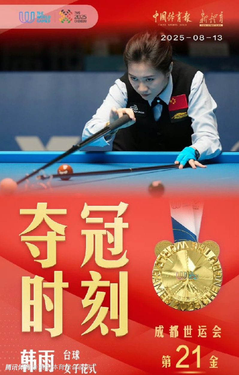 2025-08-13 22:40北京时间8月13日,成都世运会女子花式台球决赛,中国选手韩雨以7-6击败菲律宾选手森特诺,夺得冠军,这是中国台球队在本届赛事斩获的第二金,也是中国体育代表团在本届赛事摘得的第21枚金牌。