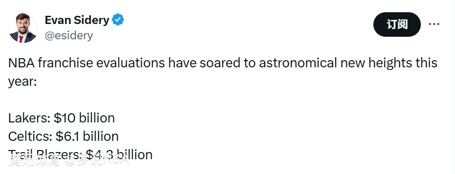 在这期间的三年里,NBA球队的价格飙升。2023年,菲尼克斯太阳队以40亿美元的估值售出,创下当时NBA球队的纪录。今年春天,波士顿凯尔特人队的大股东怀克-格罗斯贝克同意将球队出售给比尔-奇泽姆牵头的一个财团,初步估值为61亿美元。这笔交易已经获得董事会批准。随后,巴斯家族原则上同意将洛杉矶湖人队出售给金融家马克-沃尔特,这笔交易对湖人队的估值达到了创全球纪录的100亿美元。