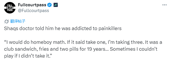 奥尼尔自曝曾对止痛药上瘾:说明书让吃1片我就吃3片 不吃有时无法上场
