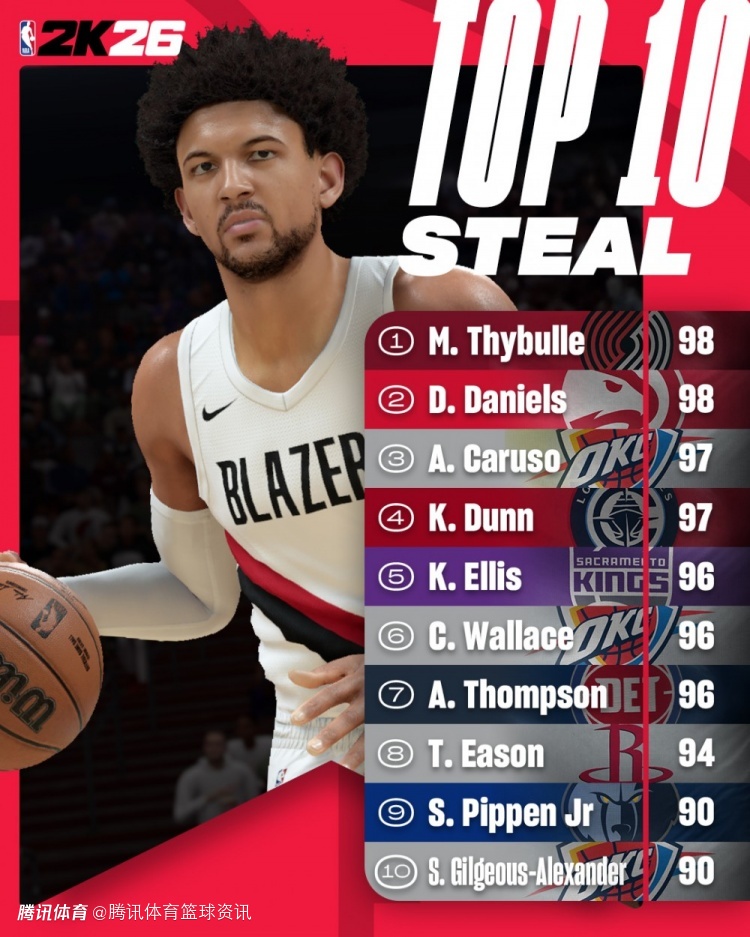 NBA 2K26公布抢断值前十:塞布尔和抢断王丹尼尔斯并列榜首 亚历山大在列