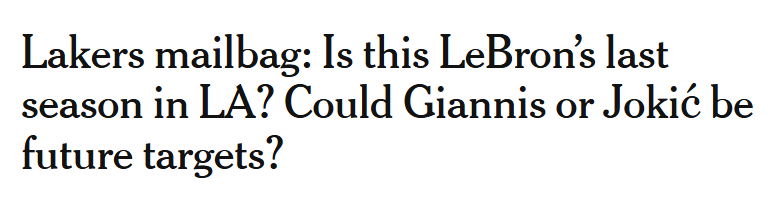 我们先解决第一个问题。湖人队目前距离第一土豪线非常近,甚至无法签下自由球员,我很难相信他们会冒险引进两位没有健康出勤记录的球员。至于第二部分,我认为球队会重新考虑引进三位顶薪球员是否可行。(如果让我选,我会选约基奇。)