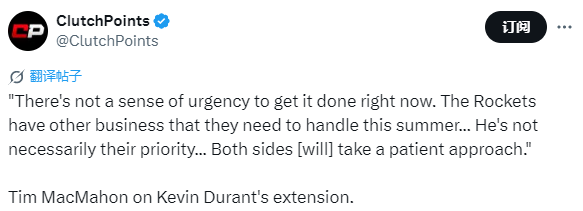 Macmahon说道:“现在并没有急于完成这件事的紧迫感。火箭队今年夏天还有其他事务需要处理,杜兰特未必是他们的首要任务,双方都会采取耐心的态度。”