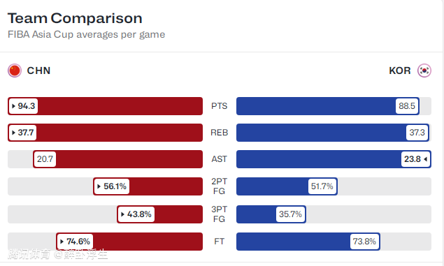 双方均是进攻型球队,中国男篮场均轰下94.3分高居亚洲杯第三,仅次于新西兰男篮104分与澳大利亚男篮96分,韩国男篮则是场均得到88.5分第四。中国男篮在本届赛事的各项命中率均是处于上风,两分命中率56.1%-51.7%占优,三分命中率43.8%-35.7%占优,罚球命中率74.6%-73.8%占优。