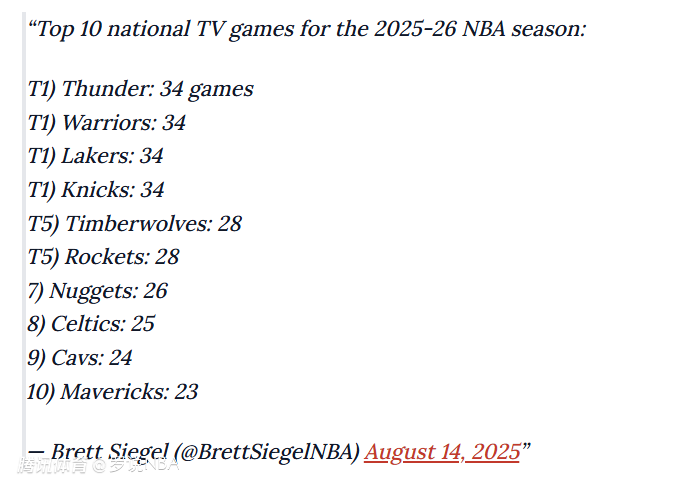 新赛季全美直播的场数方面,雷霆、勇士、湖人、尼克斯四队同为34场,并列第一