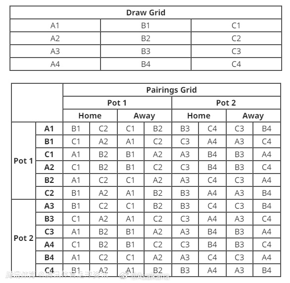 抽签依旧东西亚区分开进行,并遵循“同协会回避”原则。抽签顺序为:先从1号种子抽出A1、B1、C1、A2、B2、C2,再从2号种子抽出A3、B3、C3、A4、B4、C4,如遇同协会冲突将人工调整。