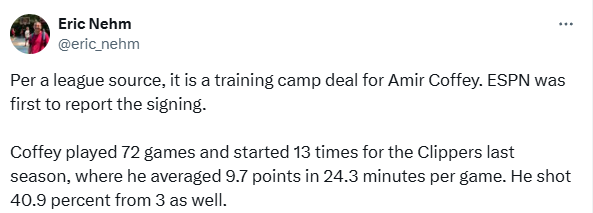 不过雄鹿记者Eric Nehm报道,科菲与雄鹿签下的是一份训练营合同。