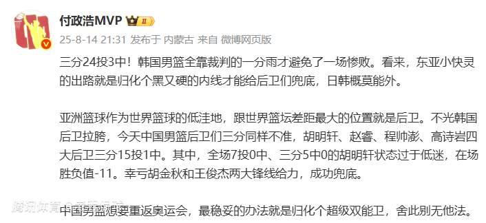 2025-08-15 07:20媒体人付政浩发文称,亚洲篮球和世界篮坛差距最大的位置就是后卫,中国男篮想要重返奥运会,最稳妥的办法就是归化超级双能卫。