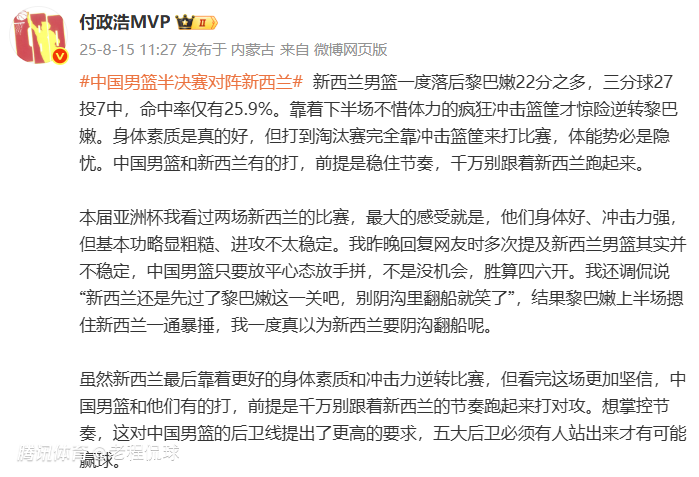 2025-08-15 16:00媒体人付政浩发文称,中国男篮在亚洲杯半决赛有机会对抗新西兰队,但前提是别进入对手的节奏打对攻。