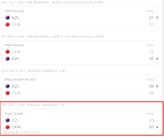 中国男篮上一次在FIBA正规比赛击败新西兰,还要追溯到2007年的斯坦科维奇杯,中国男篮以93-63大胜新西兰。