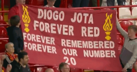 利物浦4-2拿下胜利,全队向观众鼓掌致谢。KOP看台响起若塔之歌,球迷举着若塔的球衣,悼念若塔的横幅,怀念曾经的利物浦前锋。