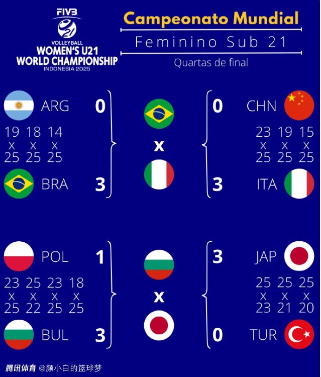 U21女排世锦赛的1/4决赛也全部打完:巴西3-0阿根廷、保加利亚3-1波兰、日本3-0土耳其、意大利3-0中国。那么四强就是意大利、日本、保加利亚、巴西;
