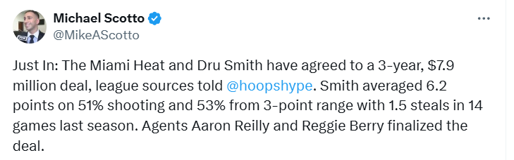 2025-08-17 07:00北京时间8月17日,根据名记Shams透露,热火队将与后卫德鲁-史密斯签下一份新的三年合同。记者Michael Scotto表示,双方达成的是一份3年790万美元的协议。