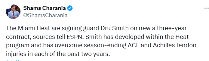 德鲁-史密斯3年790万美元续约热火 曾连续遭遇前交叉韧带+跟腱撕裂