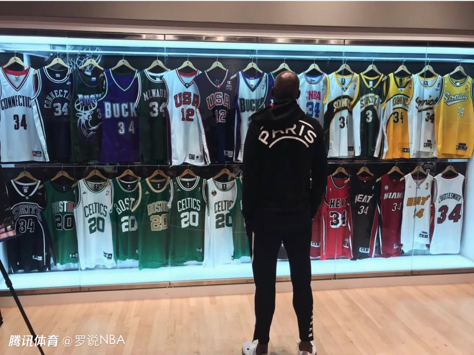 帖子中,他站在一个装满自己所有穿过的球衣的玻璃柜前,从康涅狄格大学的球衣,到美国国家队的战袍,再到他效力过的四支NBA球队的队服,一应俱全。但阿伦并没有追忆胜利或高光时刻,而是坦诚地分享了关于努力、挣扎以及铸就传奇真正需要付出什么的感悟。