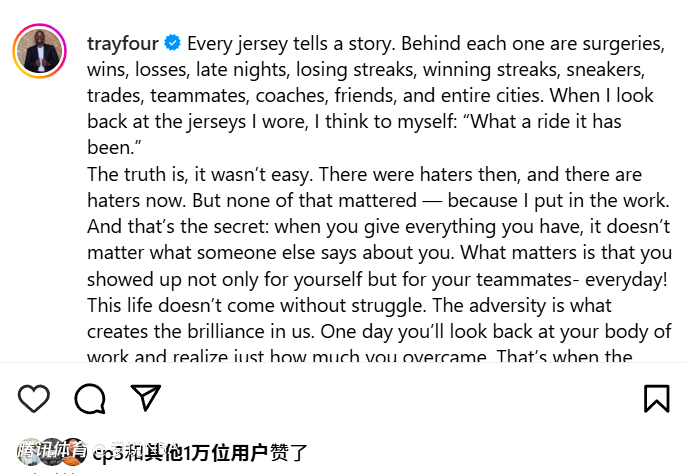 “事实是,这条路从未平坦。过去有质疑我的人,现在依然有。但这些都无关紧要——因为我付出了努力。而这就是秘诀:当你倾尽所有,别人对你的评价便无足轻重。重要的是,你每天不仅为自己而战,更为队友挺身而出!”