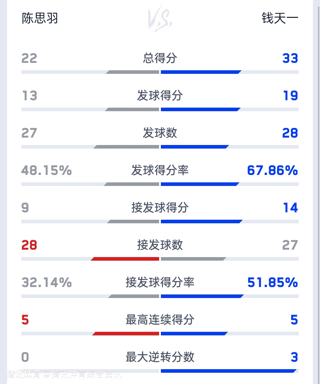 双方技术统计如下(钱天一在后):总得分22-33, 发球得分13-19,发球得分率48.15%-67.86%,接发球得分9-14。