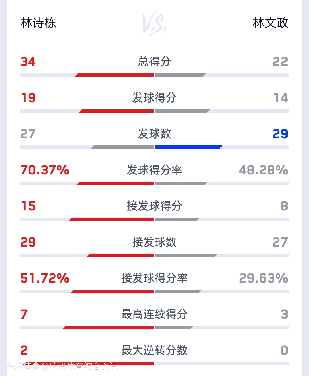 双方技术统计如下(林诗栋在前):总得分34-22,发球得分19-14,发球得分率70.37%-48.28%,接发球得分15-8。