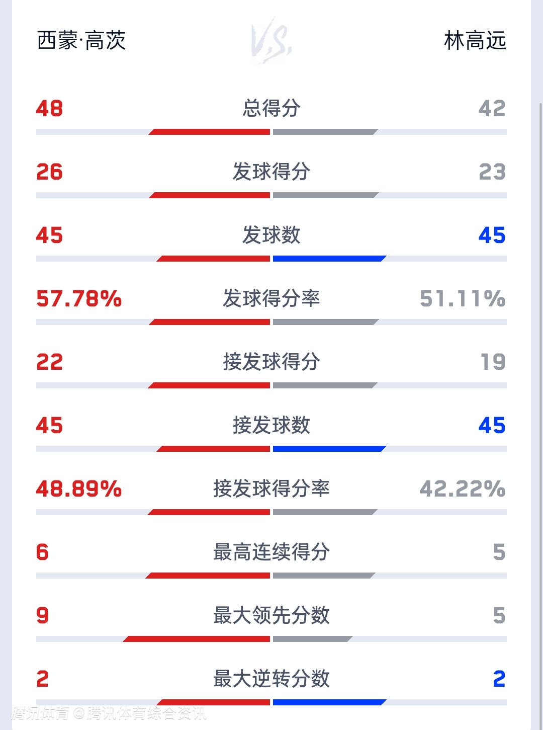 双方技术统计如下(林高远在后):总得分48-42,发球得分26-23,发球得分率57.78%-51.11%,接发球得分22-19。