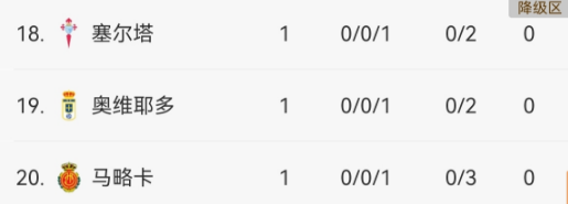 降级区:18-20:塞尔塔、奥维耶多、马略卡;