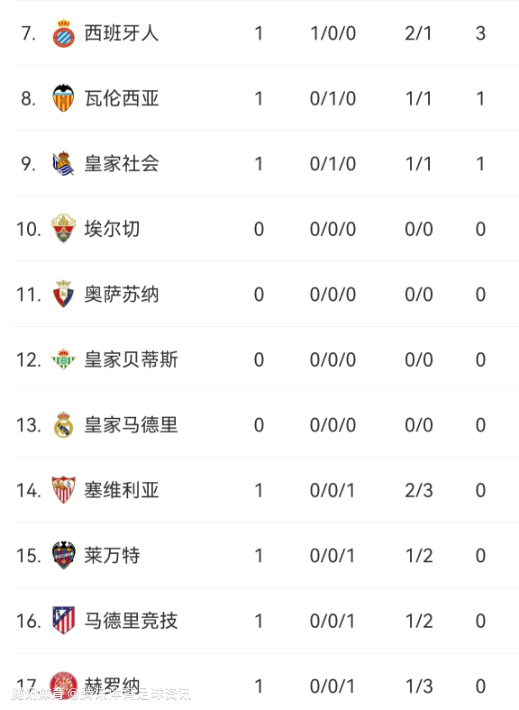 7-17分别是:西班牙人、瓦伦西亚、皇家社会、埃尔切、奥萨苏纳、皇家贝蒂斯、皇马、塞维利亚、莱万特、马竞、赫罗纳;