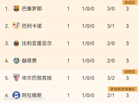 1-6分别是:巴萨、巴列卡诺、比利亚雷亚尔、赫塔费、毕尔巴鄂竞技、阿拉维斯;