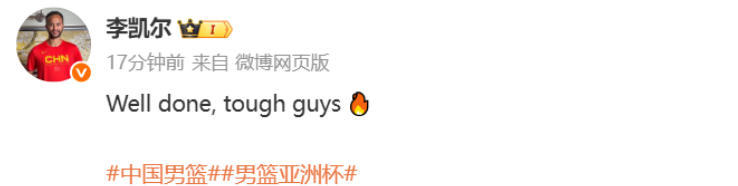 李凯尔写道:“干得好,硬汉们。”除了发文点赞之外,李凯尔还晒出了多张中国男篮球员的照片。