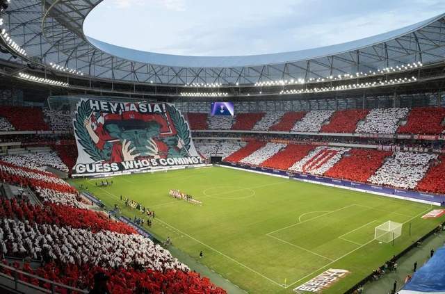 此前,J1联赛劲旅浦和红钻就以内容丰富、面积巨大的Tifo文化著称,被称为“亚洲第一主场”。3月和6月的18强赛,印尼队在容量7.7万人的雅加达球场展示了巨大Tifo,文化输出方面同样令人印象深刻:对巴林时Tifo画面是象征印尼民族传统文化的金色迦楼罗神鸟,整个Tifo覆盖了两层看台;对国足时Tifo展现的是印尼神话英雄迦多铎卡伽(Gatot Kaca)形象,他左手持绘有迦楼罗的盾牌,右手舞刀冲破城堡,象征印尼的强大力量。