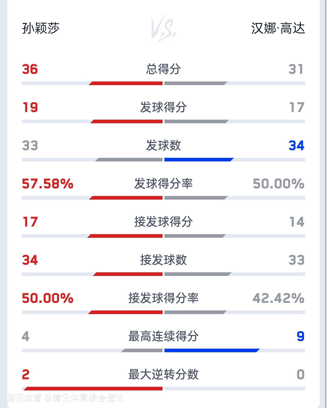 双方技术统计如下(孙颖莎在前):总得分36-31,发球得分19-17,发球得分率57.58%-50.00%,接发球得分17-14。