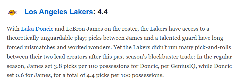 由于阵容中拥有卢卡-东契奇和勒布朗-詹姆斯,湖人队理论上具备一套难以防守的战术:长期以来,詹姆斯与一名天才后卫之间的挡拆配合总能制造错位优势,效果显著。然而,在上赛季的重磅交易之后,湖人队并未让这两位主要持球手过多地进行挡拆配合:根据Genius IQ的数据,