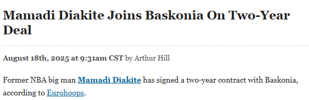 2025-08-18 23:50北京时间8月18日,据Eurohoops报道,前NBA内线球员马马迪-迪亚基特已与巴斯克尼亚队签下一份为期两年的合同。