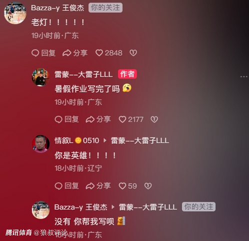 与朱俊龙的互动被调侃“雷巨 你很关键”,后者回应是“感谢,兄弟一年送哥哥两个亚军”、