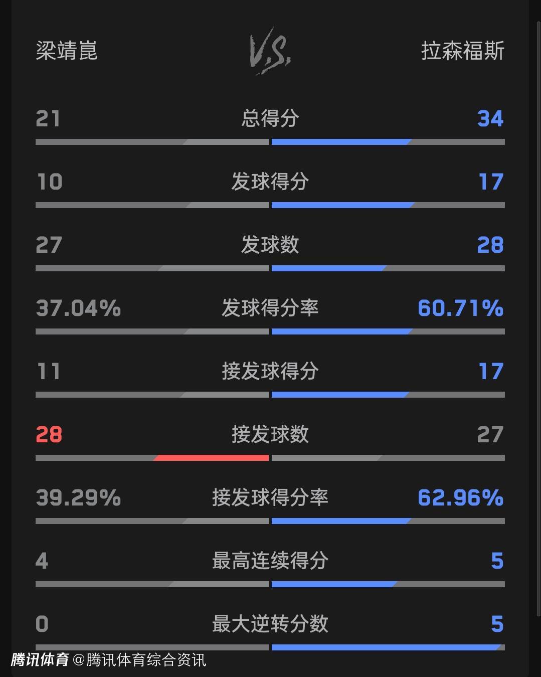 双方技术统计如下(梁靖崑在前):总得分21-34,发球得分10-17,发球得分率37.04%-60.71%,接发球得分11-17。
