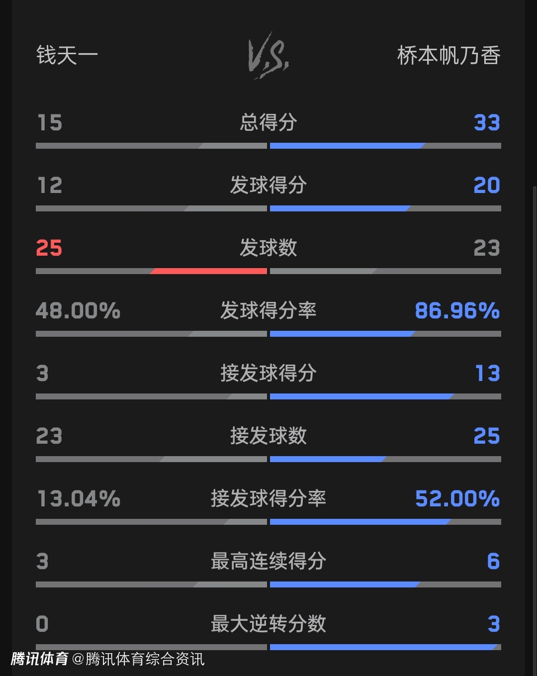双方技术统计如下(钱天一在前):总得分15-33,发球得分12-20,发球得分率48.00%-86.96%,接发球得分3-13。