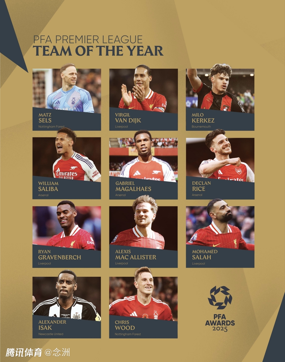2025年度英格兰职业球员工会英超最佳阵容公布,门将是泽尔斯(诺丁汉森林),后卫有范戴克(利物浦)、凯尔凯兹(伯恩茅斯)、萨利巴(阿森纳)、加布里埃尔(阿森纳),中场是赖斯(阿森纳)、赫拉芬贝赫(利物浦)、麦卡利斯特(利物浦),前锋是萨拉赫(利物浦)、伊萨克(纽卡斯尔联)、克里斯-伍德(诺丁汉森林)。