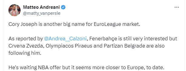 该记者表示:“科里-约瑟夫是欧洲篮球联赛市场上的又一位大牌球员。据报道,费内巴切队仍对他抱有浓厚兴趣,不过贝尔格莱德红星队、雅典奥林匹亚科斯队和贝尔格莱德游击队也在关注他。他目前在等待NBA的合同报价,但截至目前,他似乎更有可能前往欧洲。”