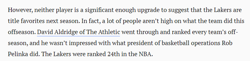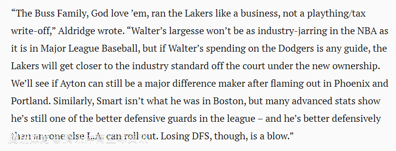 “巴斯家族,老天保佑他们,一直把湖人队当作一项事业来经营,而不是一个玩物或税务冲销工具,”奥尔德里奇写道,“沃尔特的慷慨投入在NBA或许不会像在美职棒大联盟那样引起行业震动,但如果以沃尔特在道奇队上的投入为参照,在新管理层的带领下,湖人队在场外运营方面将更接近行业标准。”