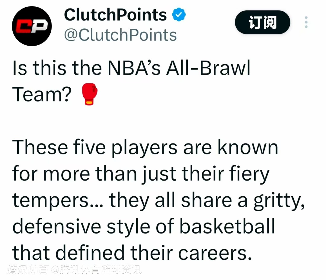 2025-08-20 11:20北京时间8月20日,美媒Clutch Points发布联盟历史上的头号“全武行阵容”,入选的五位球员不仅以火爆脾气闻名,还都有着坚韧的防守风格,这也定义了他们的职业生涯。