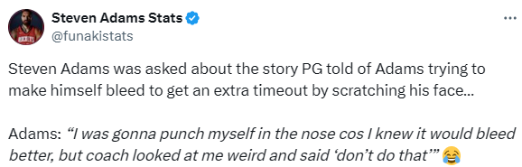 对此,亚当斯在电话里回忆道:“我当时其实是想打自己的鼻子,因为我知道那样流血会更多,但教练用一种很奇怪的眼神看着我,还跟我说‘别这么做’。所以我只能改成挠自己,可偏偏我没什么指甲,最后也没成功。” 保罗-乔治与亚当斯曾在雷霆队做过两年队友。