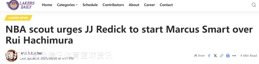 2025-08-21 09:20北京时间8月21日,根据洛媒Lakers Daily报道,一位NBA球探建议湖人主教练雷迪克用斯玛特取代八村垒打首发。