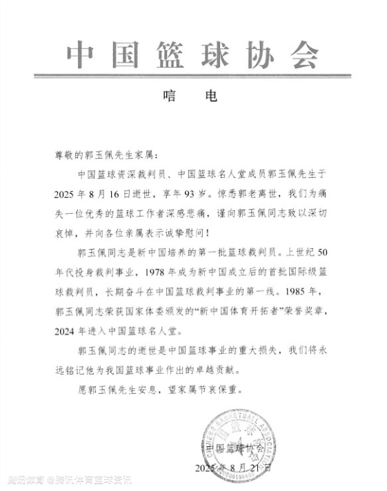 中国篮球资深裁判员、中国篮球名人堂成员郭玉佩先生于2025年8月16日逝世,享年93岁。惊悉郭老离世,我们为痛失一位优秀的篮球工作者深感悲痛,谨向郭玉佩同志致以深切哀悼,并向各位亲属表示诚挚慰问!