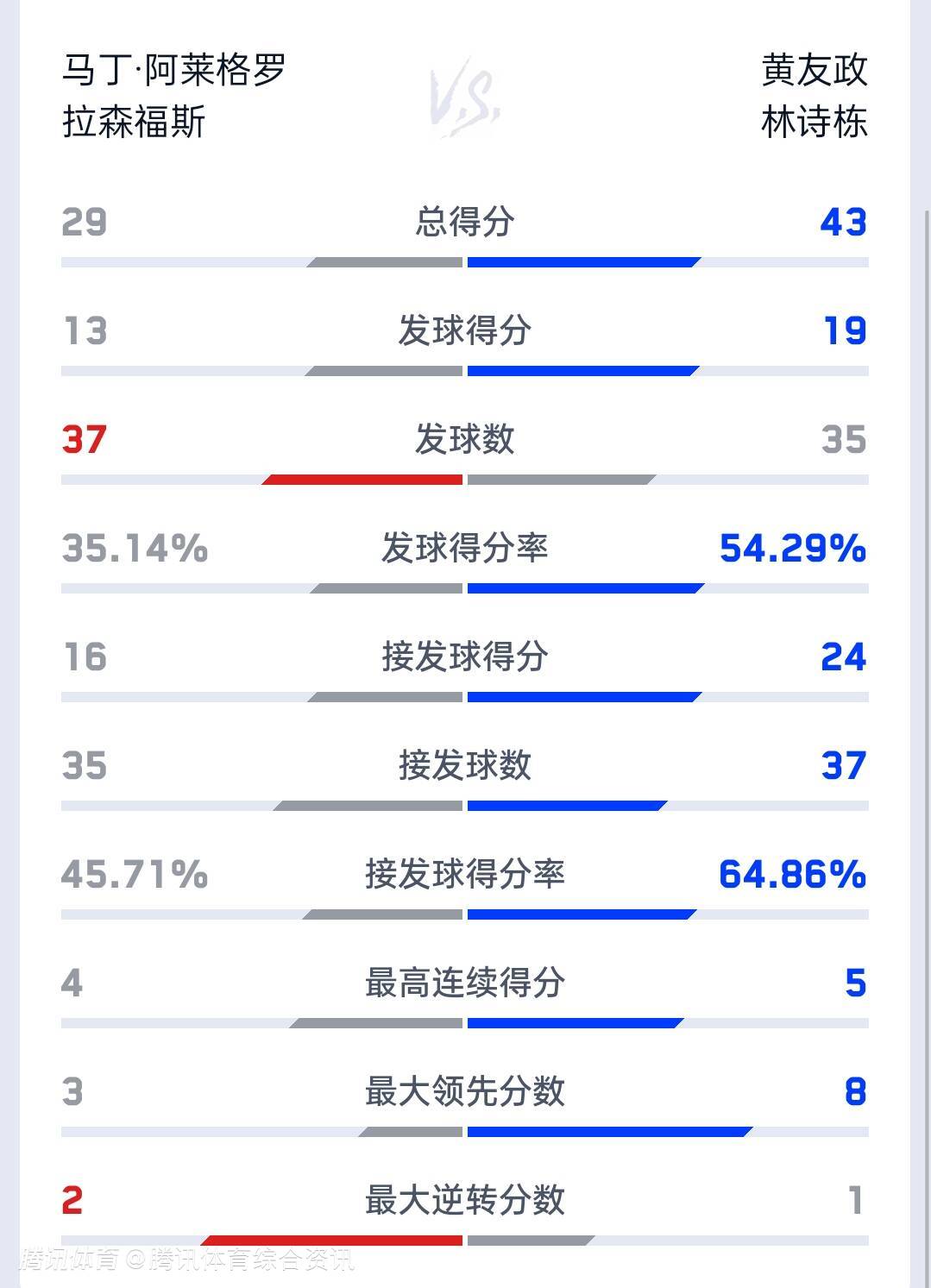 双方技术统计如下(林诗栋/黄友政在后):总得分29-43,发球得分13-19,发球得分率35.14%-54.29%,接发球得分16-24。