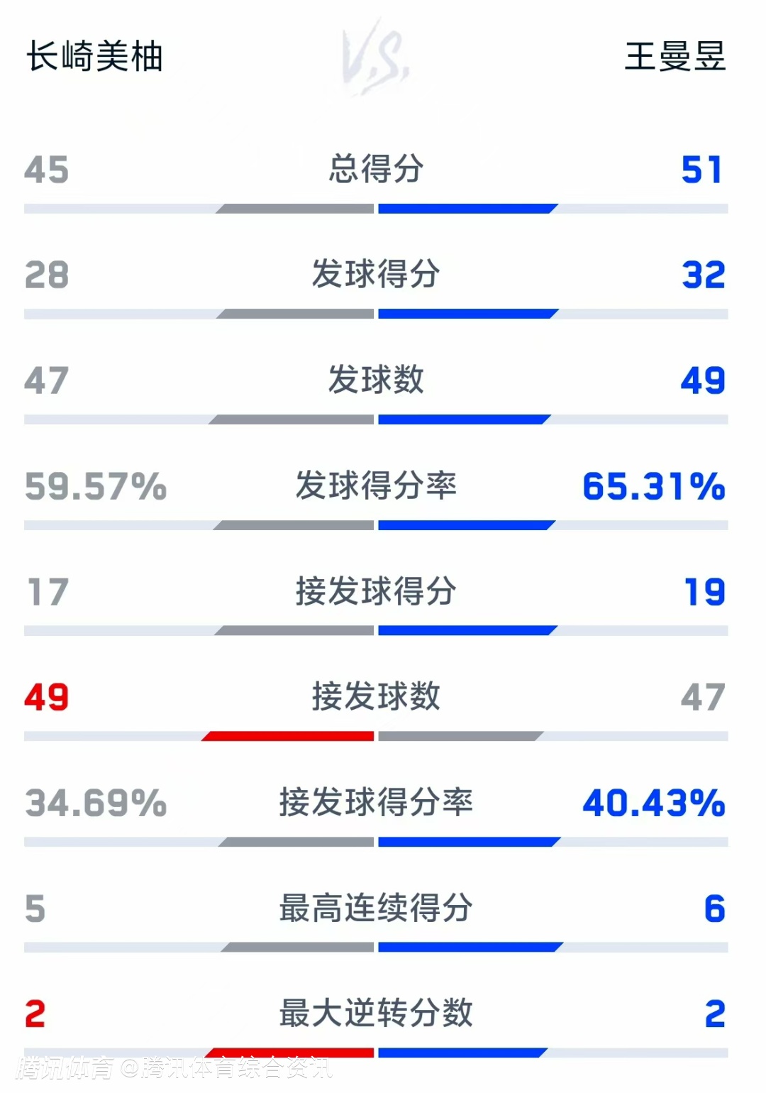 双方技术统计如下(王曼昱在后):总得分45-51,发球得分28-32,发球得分率59.57%-65.31%,接发球得分17-19。