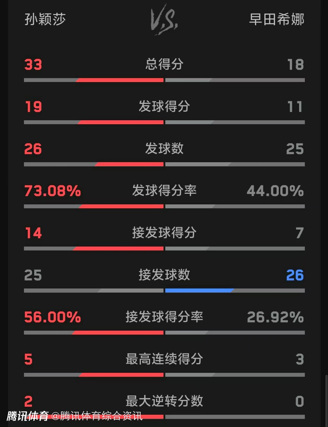 双方技术统计如下(孙颖莎在前):总得分33-18,发球得分19-11,发球得分率73.08%-44.00%,接发球得分14-7。