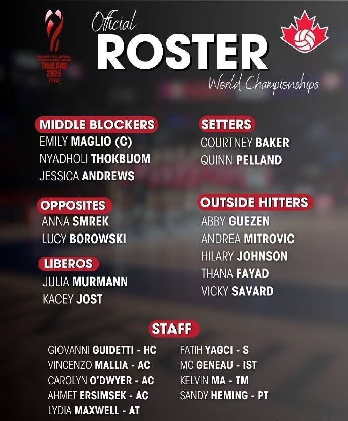 10. 加拿大女排2025年世锦赛14人名单: