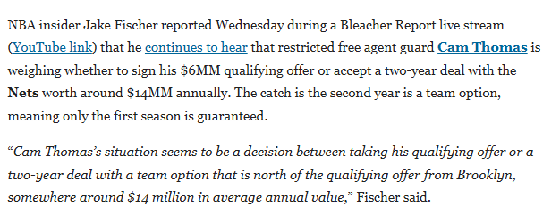 Fischer表示:“托马斯的情况似乎需要在两者间做决定:要么接受资质报价,要么接受篮网队一份为期两年、含球队选项且薪资高于资质报价的合同,其年均薪资约为1400万美元。”