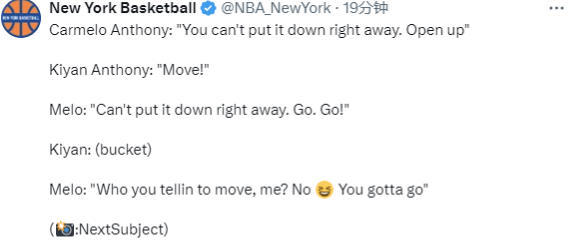 甜瓜对儿子说道:“不能马上把球放下。打开(防守)!”基扬-安东尼则说道:“移动!”甜瓜说:“不能马上把球放下。走,走起来!”在基扬-安东尼进球后,甜瓜又说道:“你刚才叫谁移动呢,我吗?不,你得自己上。”