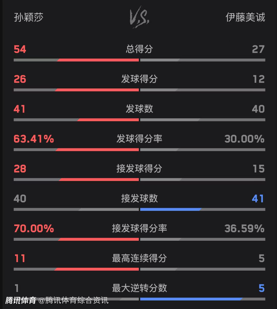 双方技术统计如下(孙颖莎在前):总得分54-27、发球得分26-12、接发球得分28-15。