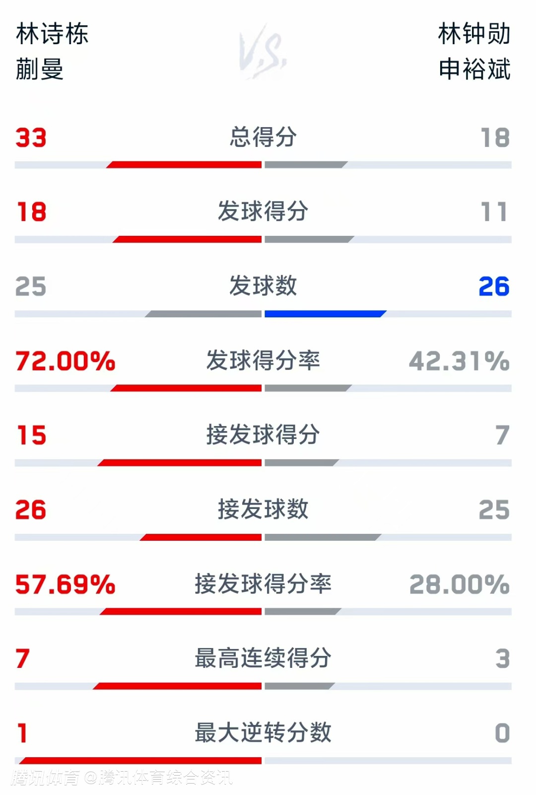 双方技术统计如下(林诗栋/蒯曼在前):总得分33-18,发球得分18-11,发球得分率72.00%-42.31%,接发球得分15-7。